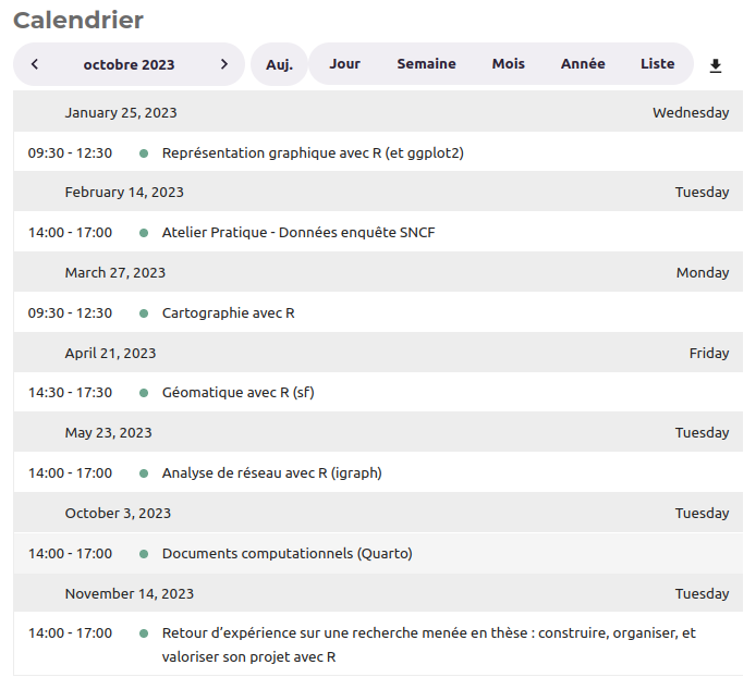 Dans cette page, on retrouve un tableau des séances passées et futures, que l’on peut chercher à extraire.