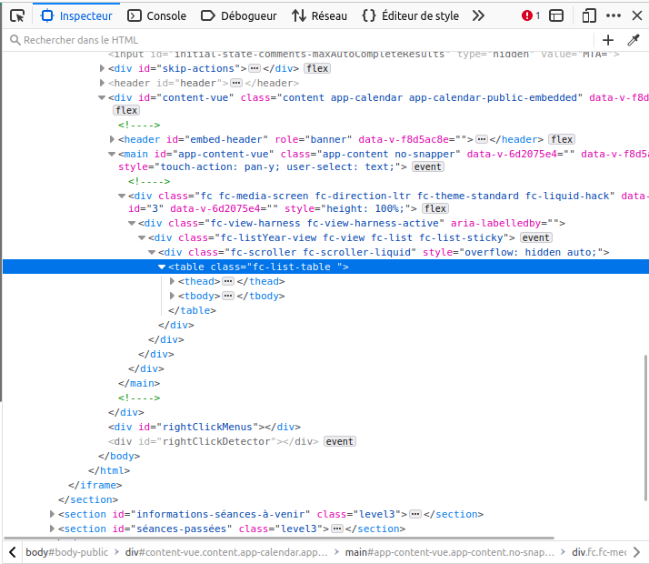 En inspectant le contenu de la page, on se rend compte que le tableau en lui-même est contenu dans une balise table, dont la classe est fc-list-table :