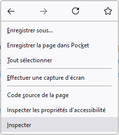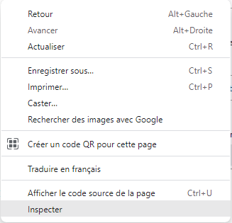 L’ensemble des navigateurs web modernes proposent des outils d’inspection du code source des pages web. L’inspecteur permet d’explorer le code source d’une page web en direct. Il facilite l’identification des balises, des classes, des identifiants et des styles associés aux éléments, et permet ainsi de procéder à une extraction ciblée de données. En utilisant l’inspecteur de code source, vous accédez à toutes les informations nécessaires pour concevoir un script de scraping. Pour y accéder, cliquez-droit n’importe où sur la page web ciblée, puis cliquez sur “Inspecter” :