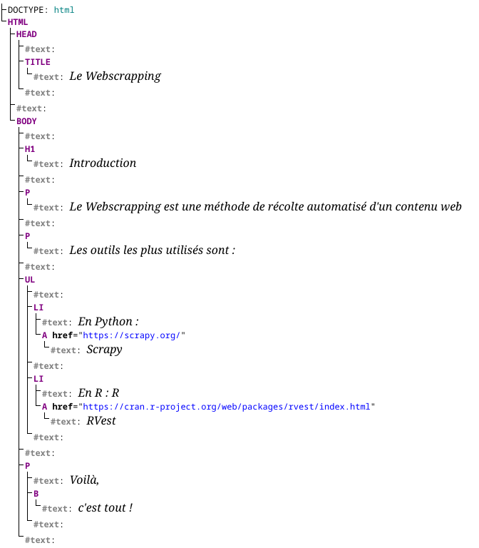Enfin, et c’est ce qui va nous intéresser le plus dans un premier temps, grâce à Javascript ou à des langage de requêtes (XPATH selector, CSS selector) il est possible de rechercher et d’extraire les éléments (ou données) qui nous intéressent dans cet arbre. Pour des raisons pédagogiques, nous traitons seulement partie Javascript dans cette section, XPATH et CSS Selector sont abordés en détail dans la section.