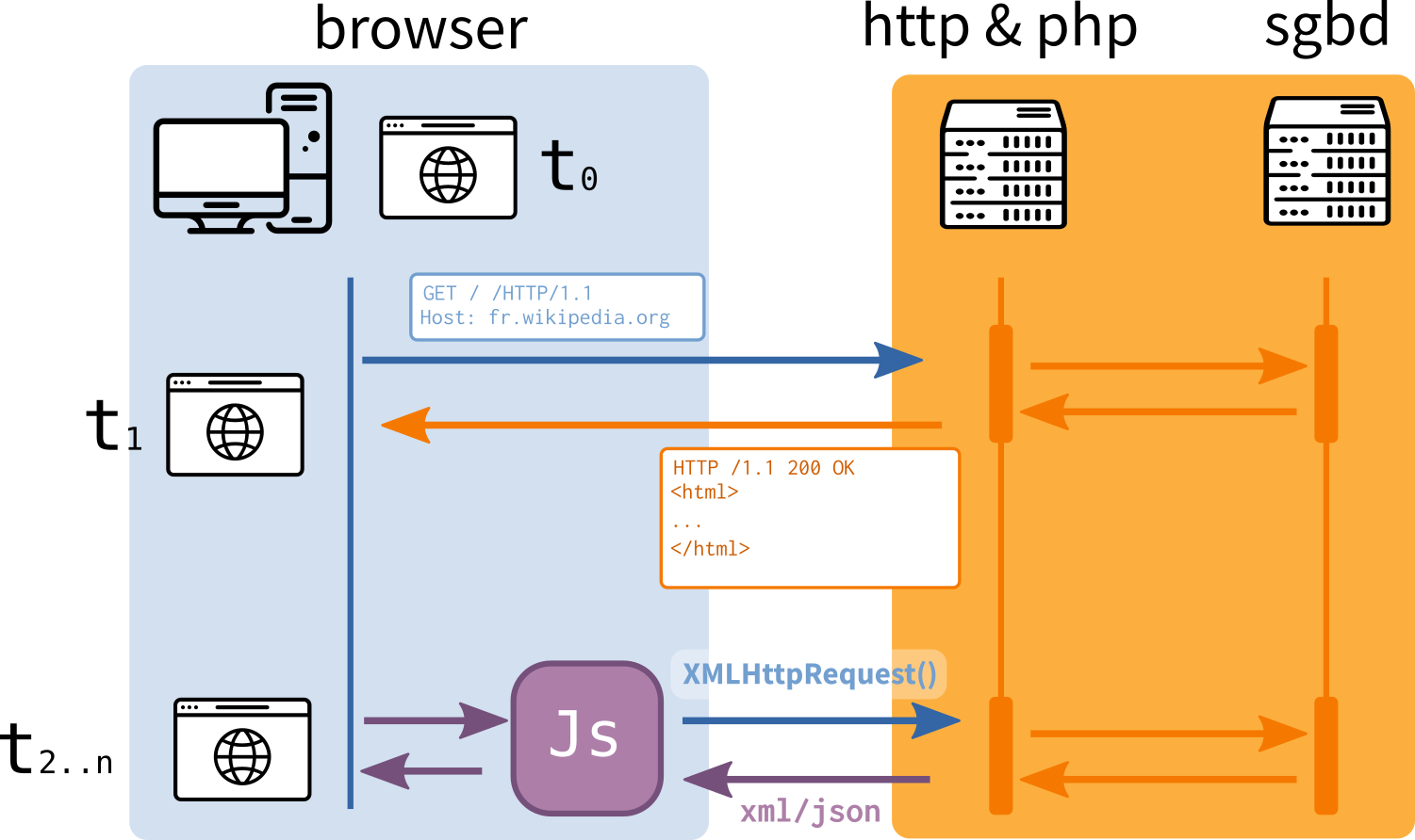 Le serveur HTTP fournit la partie html/css/js (“frontend”) qui s’affiche dans le client navigateur, mais une partie de ce html/css/js, peut être à la fois générée par le serveur (“backend”), et a posteriori par le navigateur de façon dynamique en fonction de requêtes (XMLHttpRequest() ou XHR) déclenchées par les actions utilisateurs en temps réel. Ainsi, le code source de la page web récupéré à un instant t ne contient pas nécessairement l’information définitive. Cette capacité est utilisée pour diverses raisons (rapidité d’affichage, interactivité, etc.) et sert aussi de support à des requêtes en provenance d’API.