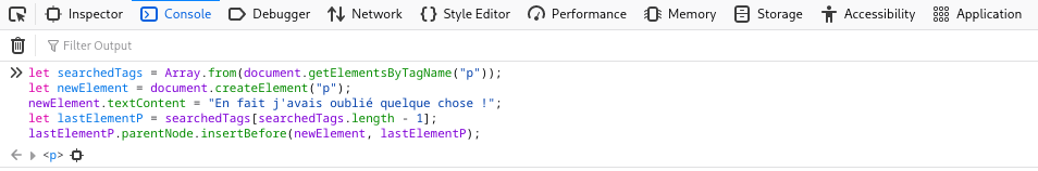 lastElementP.parentNode.insertBefore(newElement, lastElementP);Nous allons refaire cette manipulation depuis le navigateur : - Ouvrez la page toy statique. - Ouvrez les outils Web Developper Tools : ceux-ci sont accessibles l’on fait un clic droit n’importe ou sur la page, puis en selectionnant l’option Inspecteur - Mettez vous sur l’onglet Console de cette nouvelle fenêtre ouverte en bas de votre écran. - Copiez/Collez le bout de code javascript précédent et appuyez sur Entrée